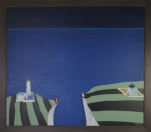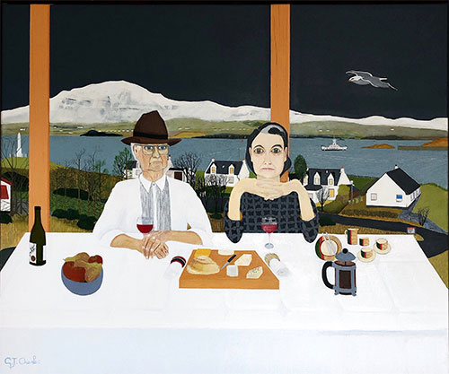 Suisnish was painted during lockdown, in winter, when I used the gallery/livingroom as my studio. I painted everything we see through our living room window, the houses opposite, the war memorial, the sea and the ferry Hallaig, and beyond the Braes (Isle of Skye). In the foreground is my wife and I, sitting at a table. Suisnish means “a fruitful place”.